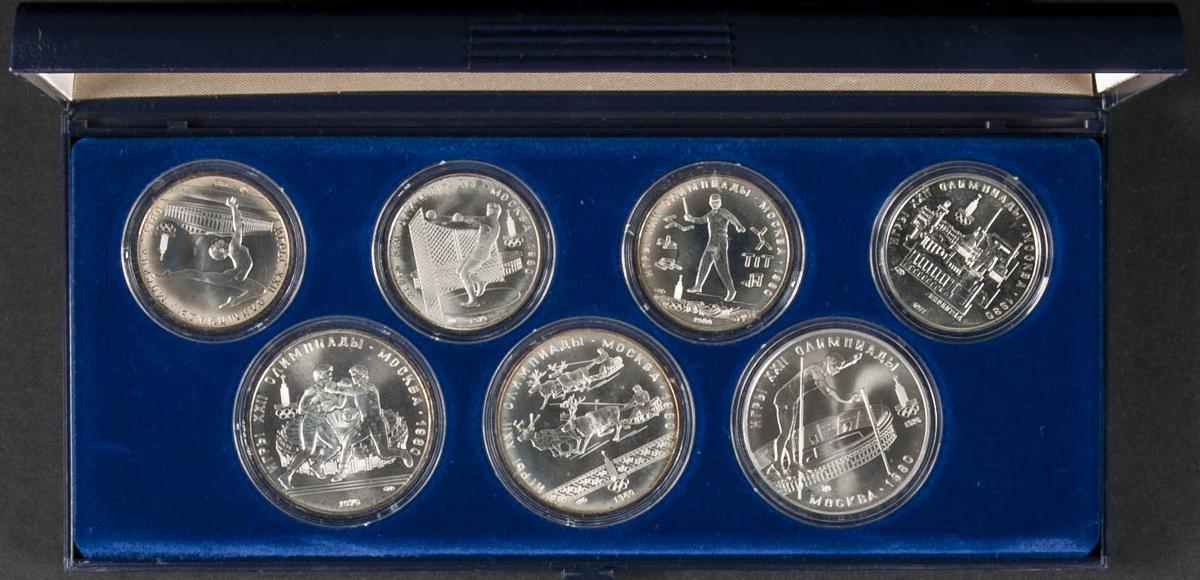RUSIA. Set completo compuesto por 7 monedas de plata con valores de 10 Rublos (3) y 5 Rublos (4). Juegos Olímpicos de Moscú 1980. SC. Incluye estuche original y cápsulas.