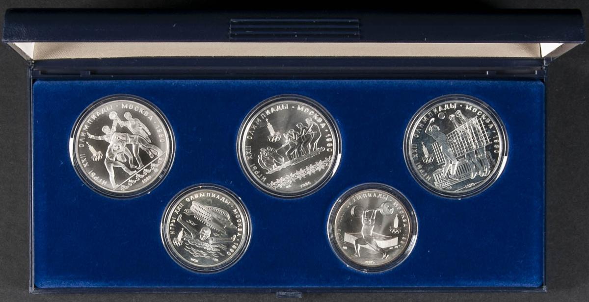 RUSIA. Set completo compuesto por 5 monedas de plata con valores de 10 Rublos (3) y 5 Rublos (2). Juegos Olímpicos de Moscú 1980. SC. Incluye estuche original y cápsulas.
