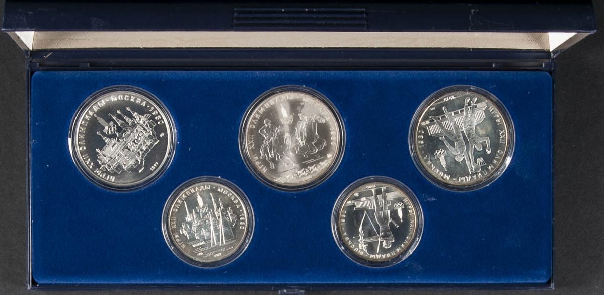 RUSIA. Set completo compuesto por 5 monedas de plata con valores de 10 Rublos (3) y 5 Rublos (2). Juegos Olímpicos de Moscú 1980. SC. Incluye estuche original y cápsulas.