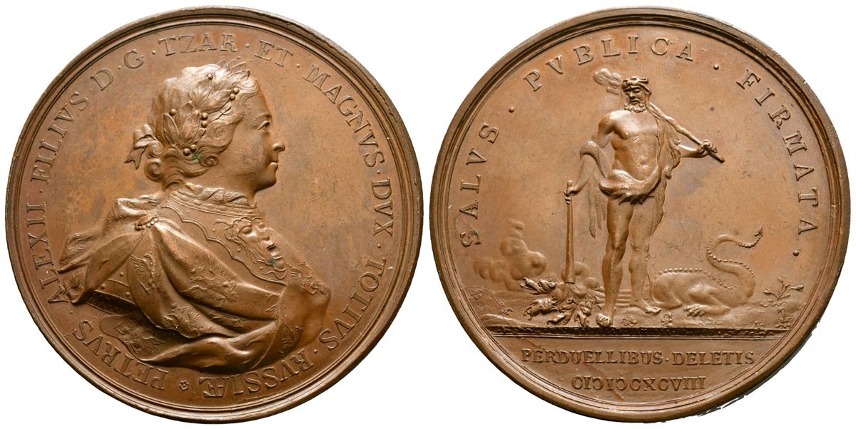 RUSIA, Pedro I (1682-1725). Medalla en conmemoración de la derrota de Streltzy. (Ae. 108,46g/66mm). 1698. (Diakov 9.1). Anv: Busto laureado y con coraza de Pedro I a derecha, alrededor leyenda: PETRVS ALEXII FILIVS DG TZAR ET MAGNVS DVX TOTIVS RVSSIAE. Rev: Hércules estante a izquierda con mazo y garrote de Hidra con muchas cabezas, encima leyenda: SALVS PVBLICA FIRMATA, en exergo: PERDUELLIBUS DELETIS/CICICCXCVIII. Grabador: Samuel Judín. EBC. Leves marquitas. Escasa.Los Streltzy o streltsí fueron unas facciones del ejercito ruso que se levantaron contra el Zar Pedro I por diferentes motivos y que terminaron siendo aniquilados por las tropas gubernamentales .