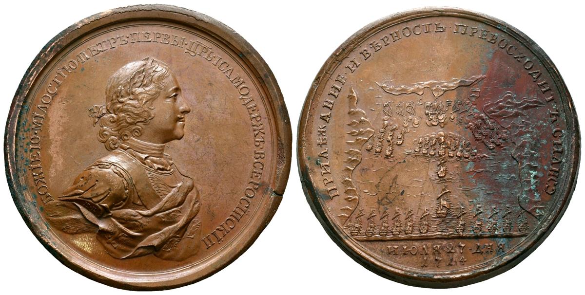 RUSIA, Pedro I (1682-1725). Medalla en conmemoración de la victoria naval en Gangut. (Ae. 104,16g/61mm). 1714 (reacuñación oficial entre 1845 y 1872). (Diakov 47.9). Anv: Busto laureado y acorazado de Pedro I a derecha, alrededor leyenda cirílica. Rev: Escenario naval donde la flota sueca aparece rodeada por las galeras rusas y flanquedos por islas, tanto alrededor como en el exergo leyendas cirílicas. Grabador: Michael Kutschkin (MK en manga del anverso). EBC-. Oxidaciones. Escasa.