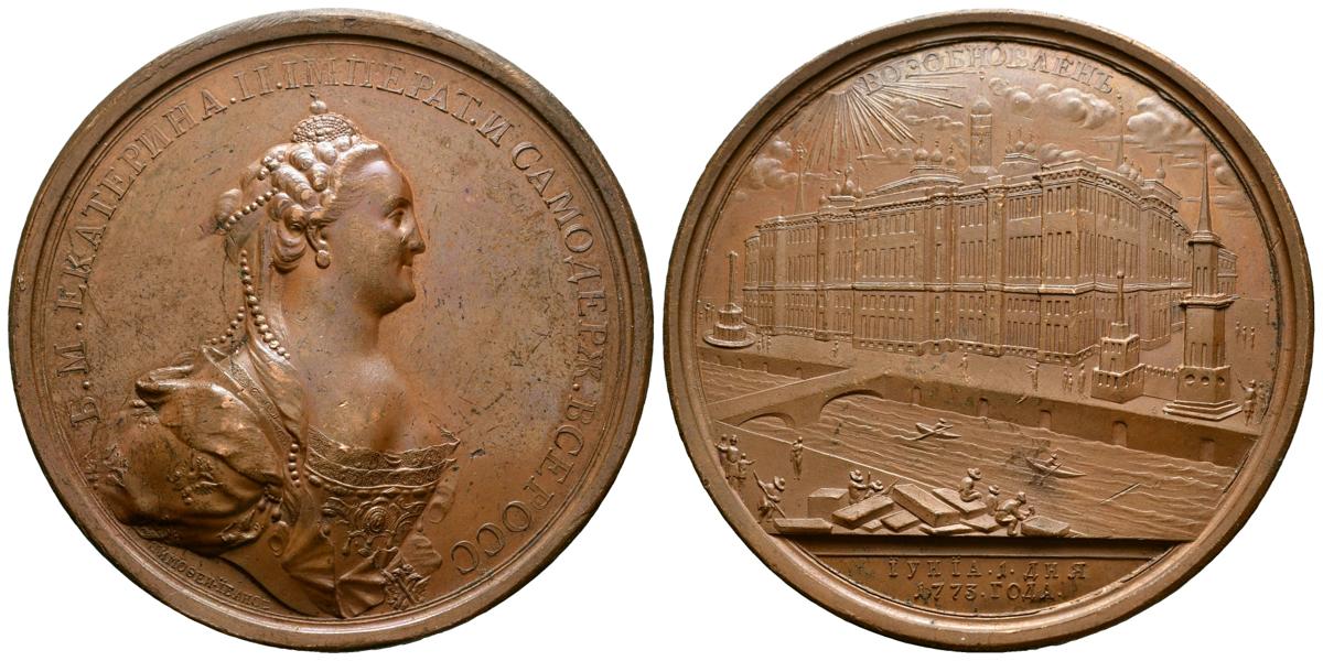 RUSIA, Catalina II La Grande (1762-1796). Medalla en conmemoración de la restauración del Kremlin. (Ae. 95,02g/65mm). 1773. (Diakov 163.1). Anv: Busto coronado y cubierto de Catalina II a derecha, alrededor leyenda cirílica. Rev: Vista del Kremlin a orillas del río Moscova, en exergo leyenda cirílica. Grabador: T. Ivanov. EBC. Leves marquitas. Escasa.