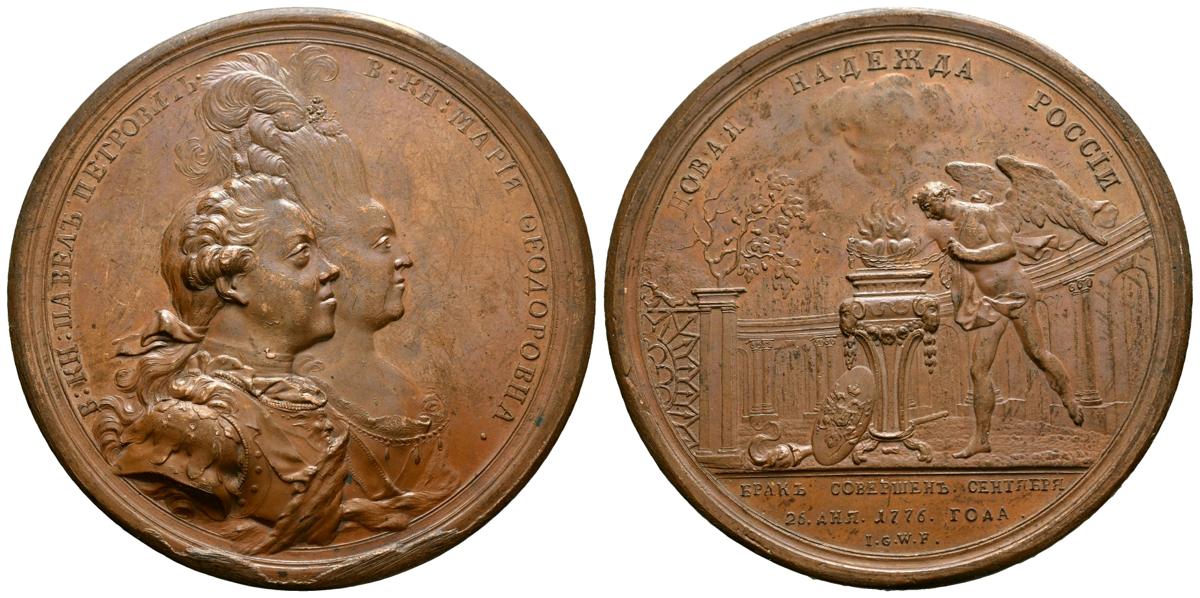 RUSIA, Catalina II La Grande (1762-1796). Medalla en conmemoración de la boda del Gran Príncipe Paul Petrovich (Futuro Zar Pablo I) con la Princesa María Feodorovna. (Ae. 94,33g/66mm). 1776. (Diakov 170.1). Anv: Bustos unidos del Príncipe Paul Petrovich drapeado y con armadura y de la Princesa María Feodorovna drapeado y con peinado muy alto, alrededor leyenda cirílica. Rev: Himeneo ata dos corozanes llameantes con una cadena, tanto alrededor como en el exergo leyenda en cirílico. Grabador: J.G. Waechter (IGWF). EBC. Ligeras marquitas. Escasa.