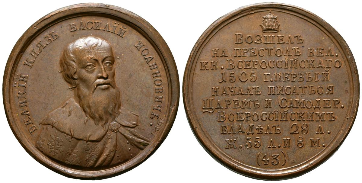 RUSIA, Gran Duque Vasily IV Ionnovich (1505-1533). Medalla. (Ae. 26,57g/39mm). S/D. (Acuñada a finales del siglo XVII). Ejemplar de una serie de 65 medallas de retratos de los grandes Duques, Zares y Emperadores rusos. Inciales de Grabador: L.B.G. (Diakov 146). EBC. Escasa.