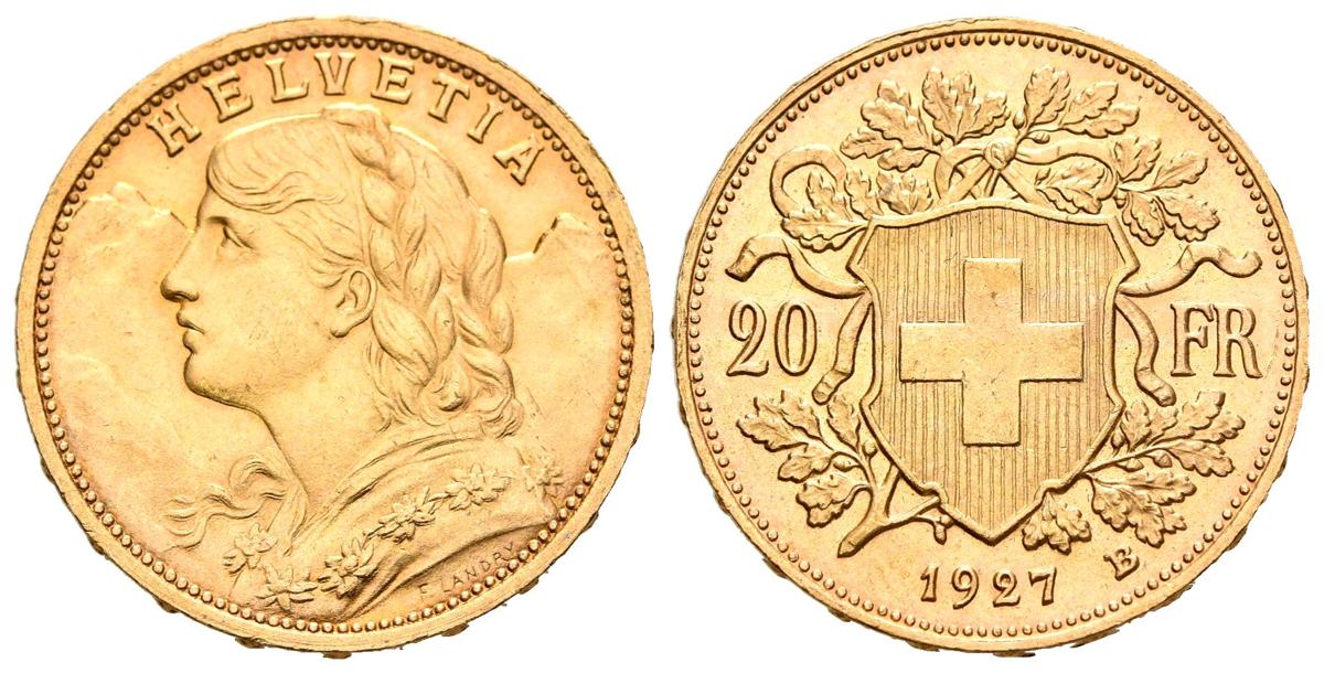 SUIZA. 20 Francos (Au. 6,45g/21mm). 1927. Berna B. (Km#35.1). SC-. Precioso ejemplar.