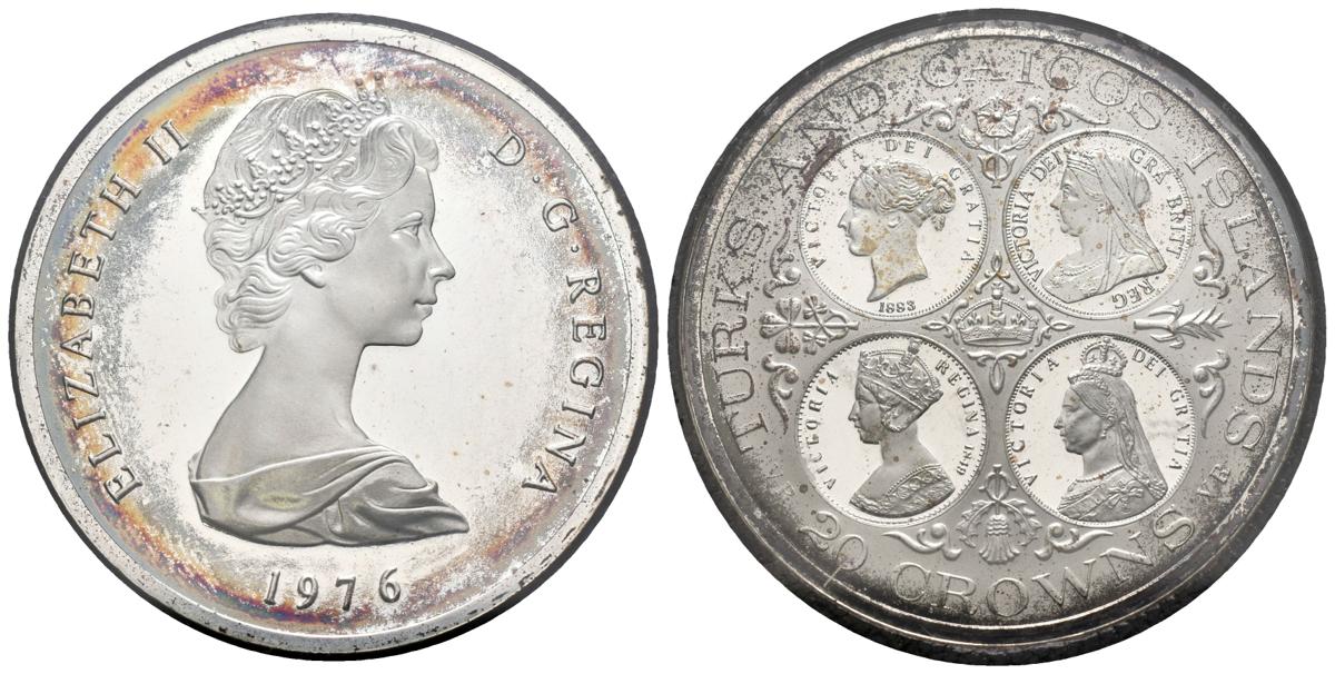 TURKS AND CAICOS. 20 Crowns (Ar. 38,72g/45mm). 1976. Isabel II. Cuatro Victorias. (Km#14). PROOF. Incluye estuche.