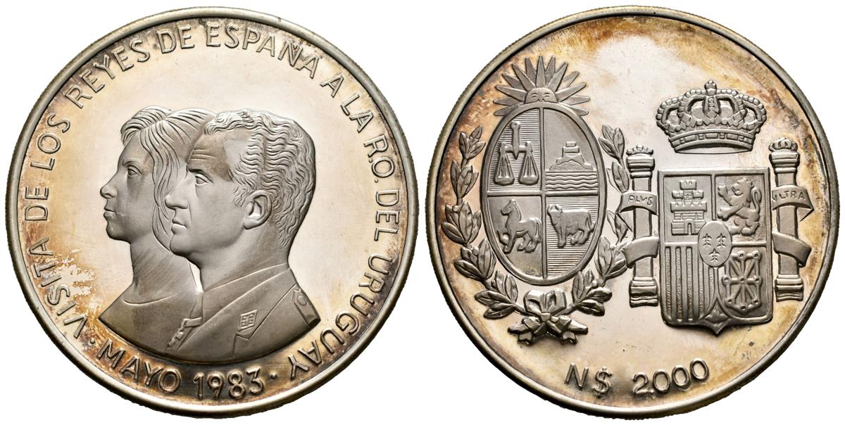 URUGUAY. 20.000 Nuevos Pesos (Ar. 65,00g/50mm). 1983. Visita de los Reyes de España. (Km#131). PROOF. Incluye estuche original y certificado de autenticidad.