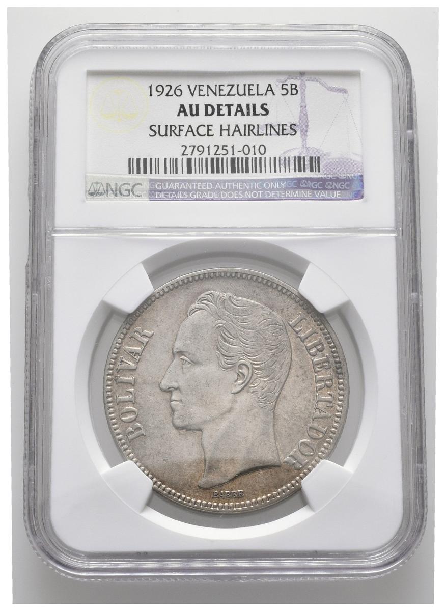 ESTADOS UNIDOS DE VENEZUELA. 5 Bolívares. (Ar. 25,00g/37mm). 1926. Philadelphia. (Km#Y24.2). Encapsulado NGC AU Details. Rayitas.