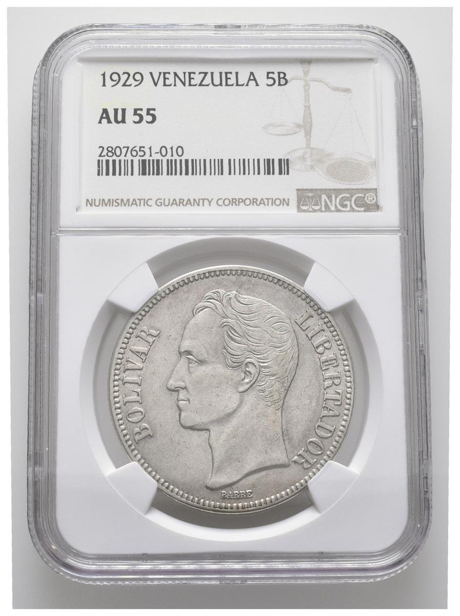 ESTADOS UNIDOS DE VENEZUELA. 5 Bolívares. (Ar. 25,00mm/37mm). 1929. Philadelphia. (KM-Y24.2). Encapsulado NGC AU-55.