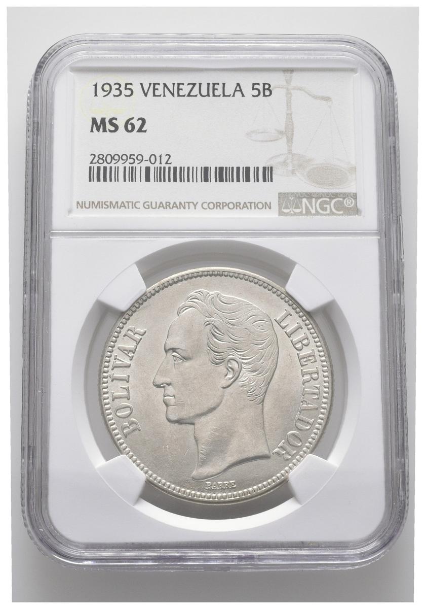 ESTADOS UNIDOS DE VENEZUELA. 5 Bolívares. (Ar. 25,00g/37mm). 1935. Philadelphia. (Km#Y24.2). Encapsulado NGC MS-62.