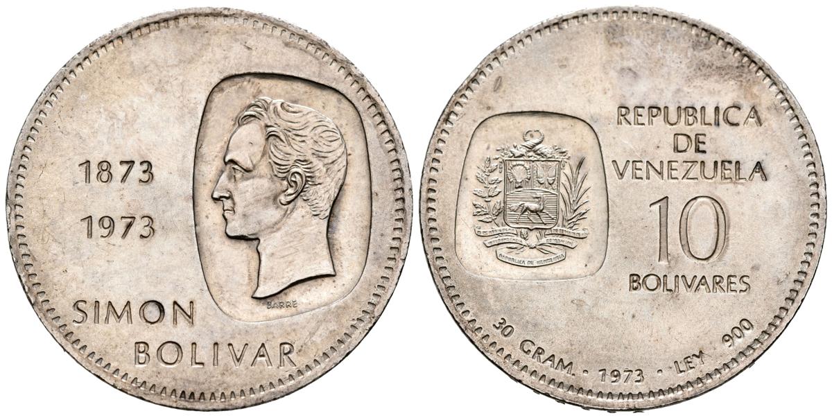 VENEZUELA. 10 Bolívares. (Ar. 30,18g/39mm). 1973. Centenario de la efigie de Simón Bolivar en la moneda (1873-1973). (Km#45). EBC. Golpectios en listel.