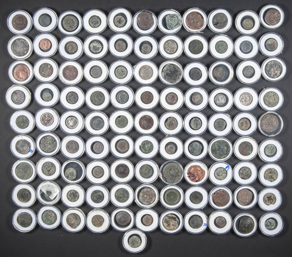 Conjunto de más de 100 monedas, fundamentalmente bronces pequeños de diferentes épocas (íberas, romanas, medievales, monarquía y alguna extranjeras). Diferentes estados de conservación. A EXAMINAR.