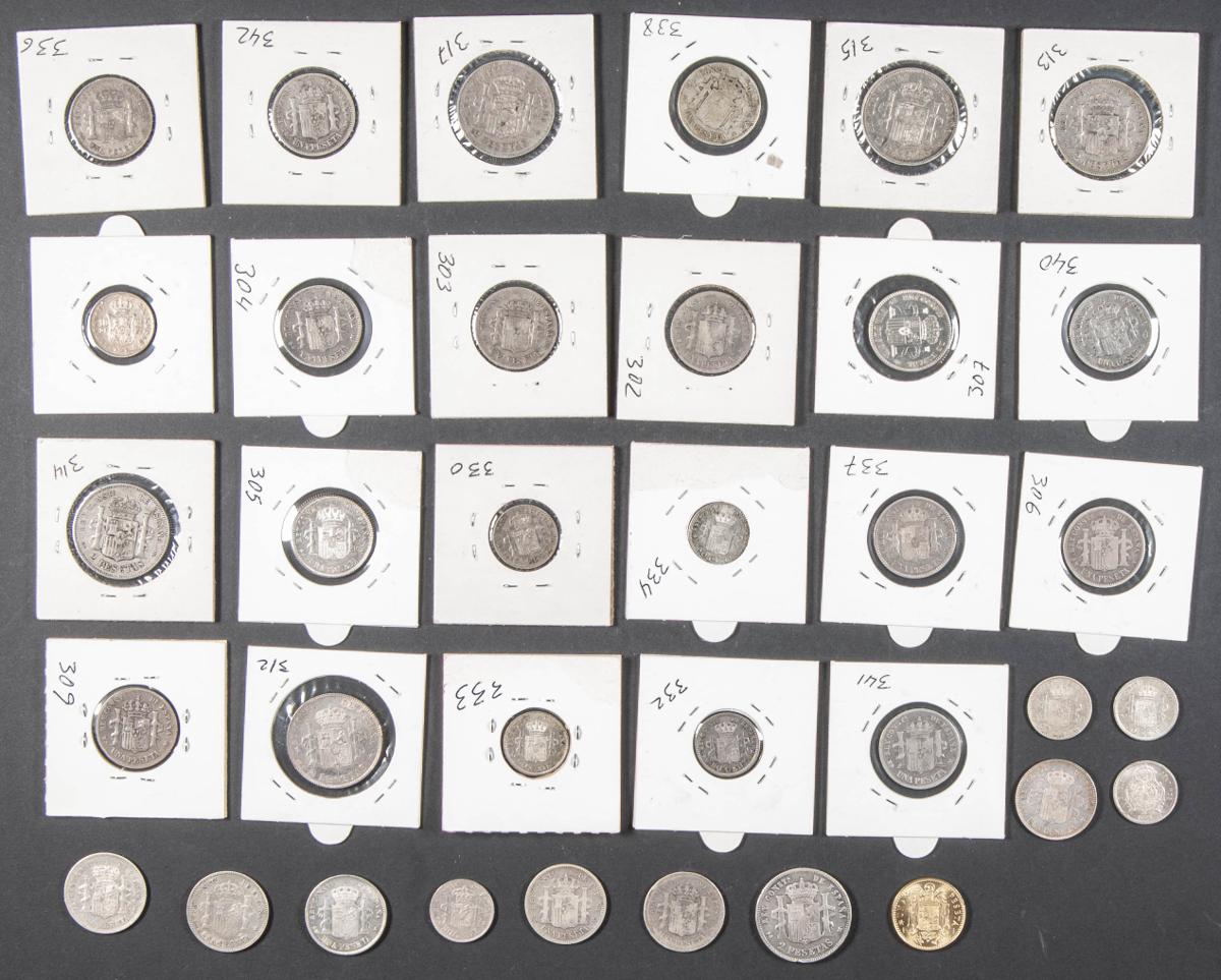 CENTENARIO DE LA PESETA. Precioso conjunto de 34 piezas de módulos de 50 Céntimos, 1 y 2 Pesetas acuñadas en los reinados de Alfonso XII y XIII. Gran variedad de fechas, algunas escasas y alguna sobrefecha, y diversos estados de conservación con piezas en alta graduación. Incluye varias piezas del módulo de 1 Peseta en estado SC- o SC (1896, 1899, 1901 o 1903) y la Peseta de 1975 variante punto sobre ñ en SC. A EXAMINAR