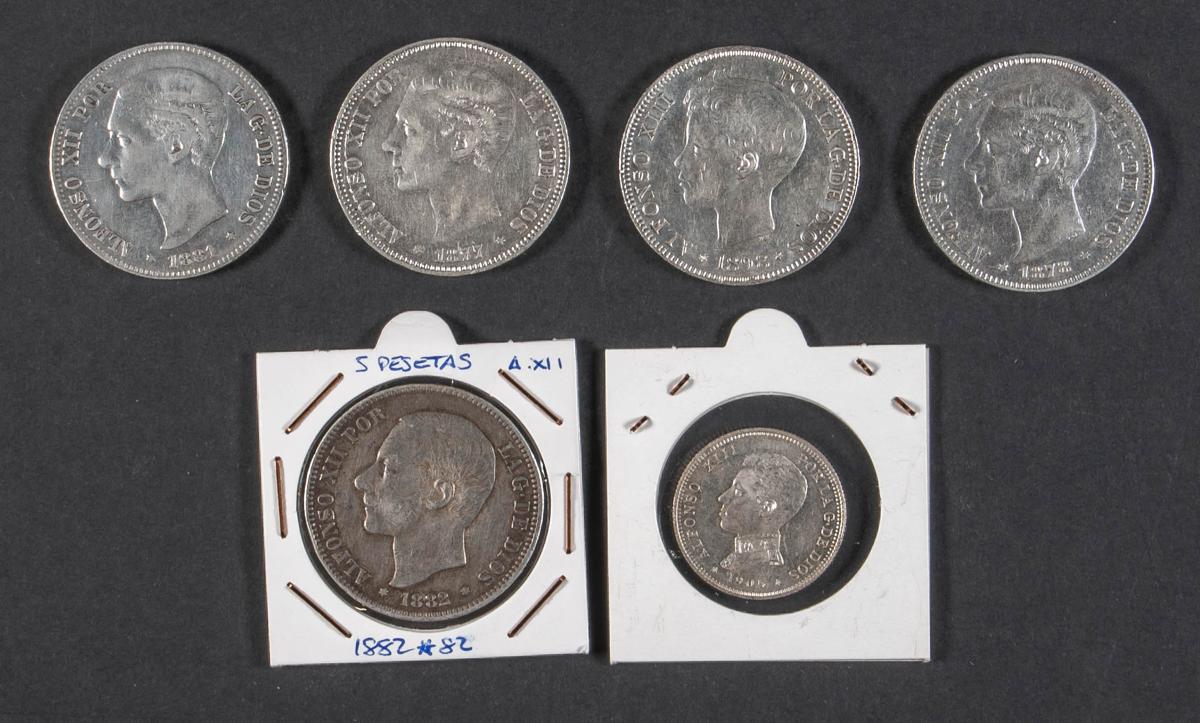 CENTENARIO DE LA PESETA. Bonito e interesante conjunto de 6 monedas, 5 del módulo de 5 Pesetas, acuñados en los reinados de Alfonso XII y Alfonso XIII. Diferentes estados de conservación. A EXAMINAR