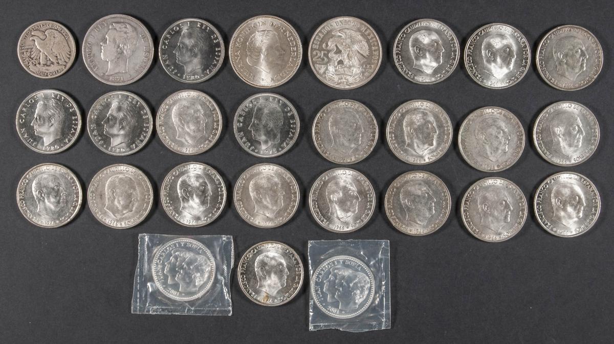 Interesante conjunto de 27 piezas en su mayoría de plata y acuñadas principalmente en España. Destacan 17 monedas de 100 Pesetas 1966 (*66 y 67) así como 1 Duro de Amadeo de 1871. Diferentes estados de conservación. A EXAMINAR