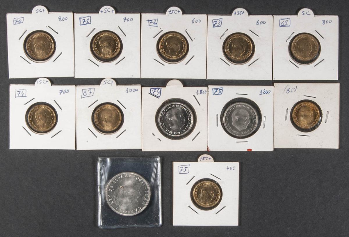 ESTADO ESPAÑOL. Conjunto de 12 piezas, en su mayoría del módulo de 1 Peseta de 1966, todas con diferentes estrellas. Ninguna moneda repetida. Incluye una pieza de 25 Pesetas 1957 *75 y 100 Pesetas de 1980 de Juan Carlos I. Todas las monedas en estado SC. A EXAMINAR.