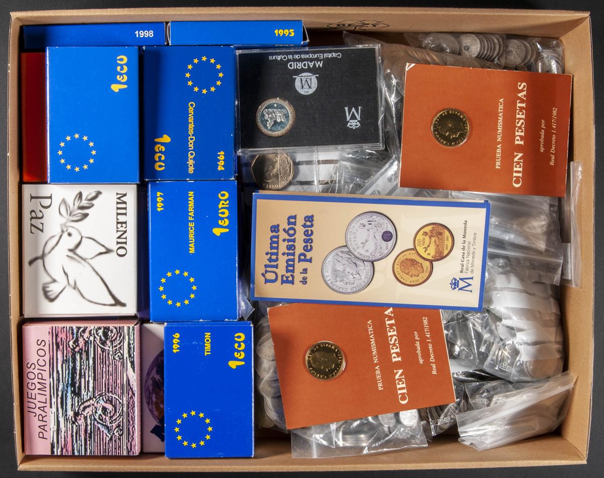 ESTADO ESPAÑOL Y JUAN CARLOS I. Magnífico conjunto formado por centenares de monedas de ambos periodos. Destacan un buen número de estuche y de piezas en plata y con valores en Pesetas, Euros y Ecus. Gran variedad de fechas, módulos y tipo, incluyendo pruebas. Diferentes estados de conservación incluyendo piezas SC. A EXAMINAR.