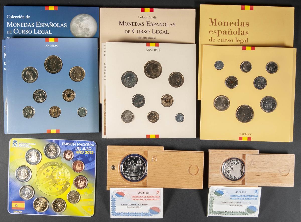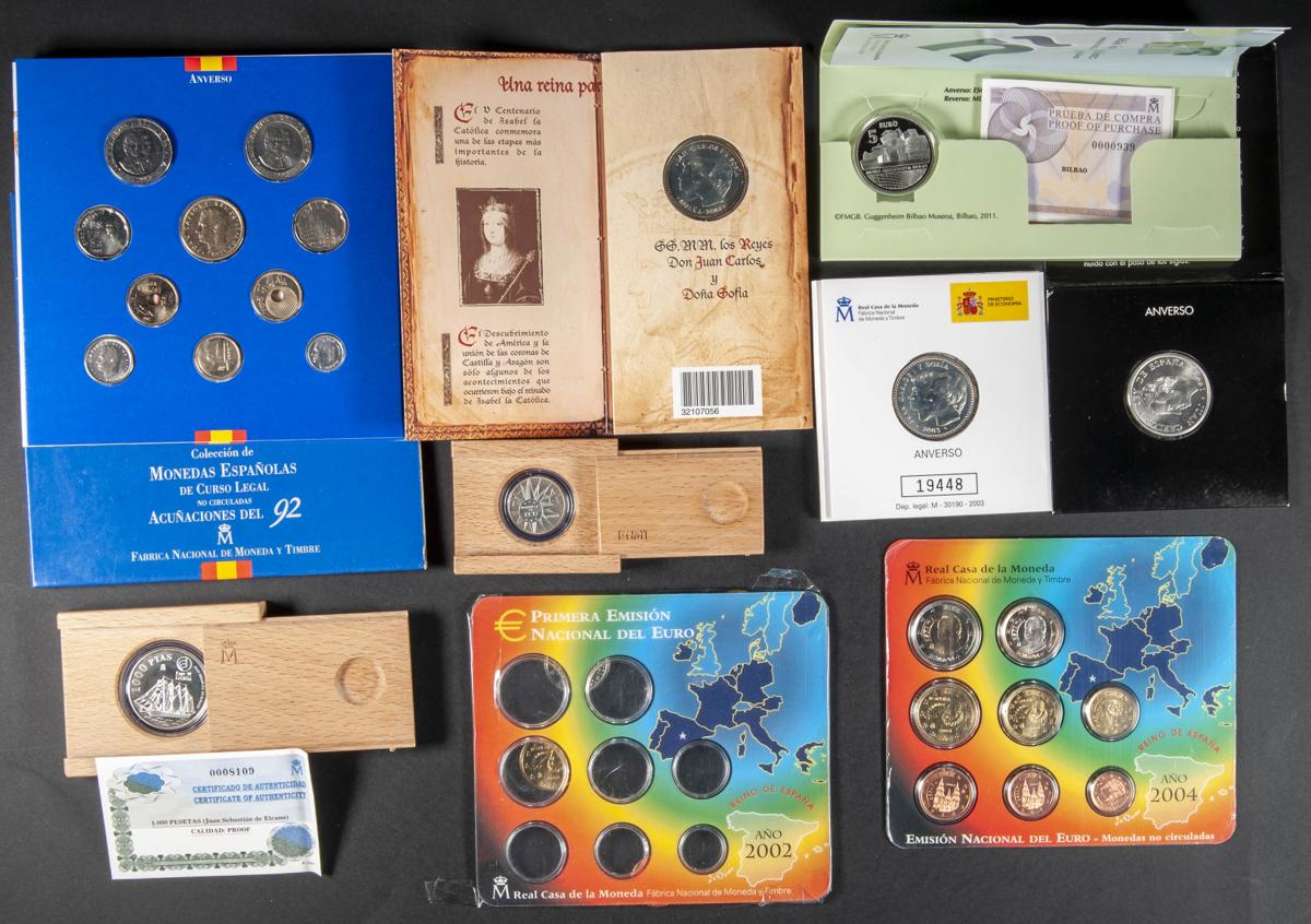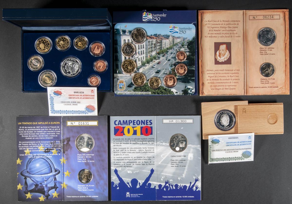 CONTEMPORÁNEO. Conjunto de 27 set o estuches de diferentes valores (Euros y Pesetas), fechas y eventos conmemorativos. Gran cantidad de piezas en plata. Piezas en SC. A EXAMINAR.
