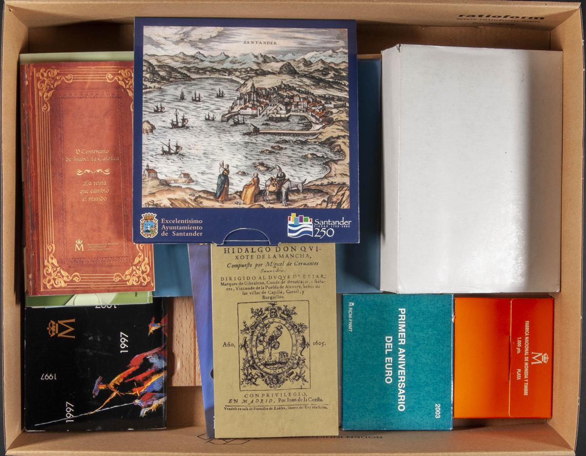 CONTEMPORÁNEO. Conjunto de 27 set o estuches de diferentes valores (Euros y Pesetas), fechas y eventos conmemorativos. Gran cantidad de piezas en plata. Piezas en SC. A EXAMINAR.