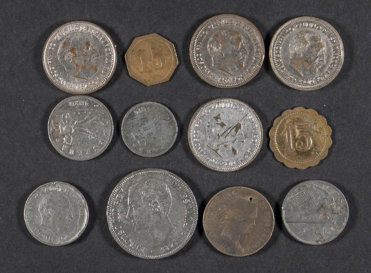 ESPAÑA. Interesante conjunto formado por 12 piezas falsas de época en su mayoría, de diferentes épocas, materiales y módulos. El conjunto incluye también algunas fichas. Diferentes estados de conservación. A EXAMINAR.