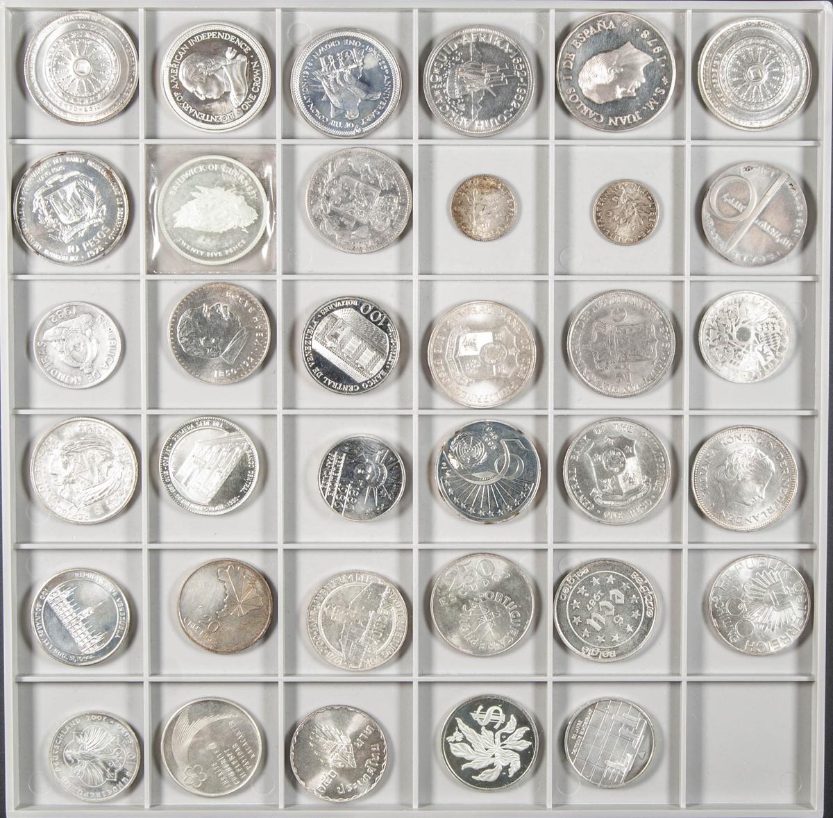 MONEDA EXTRANJERA. Magnífico conjunto formado por 35 monedas de plata en su mayoría de módulo tipo duro y acuñadas durante el siglo XX. Gran variedad de países representados así como fechas de acuñación. Alto nivel de conservación general. A EXAMINAR.