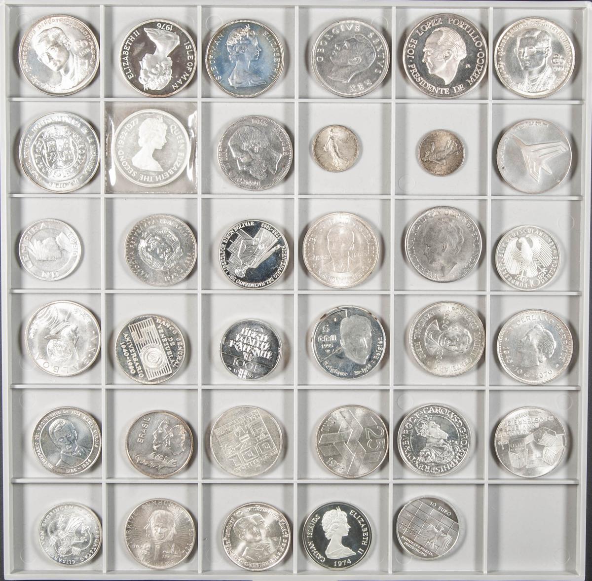 MONEDA EXTRANJERA. Magnífico conjunto formado por 35 monedas de plata en su mayoría de módulo tipo duro y acuñadas durante el siglo XX. Gran variedad de países representados así como fechas de acuñación. Alto nivel de conservación general. A EXAMINAR.