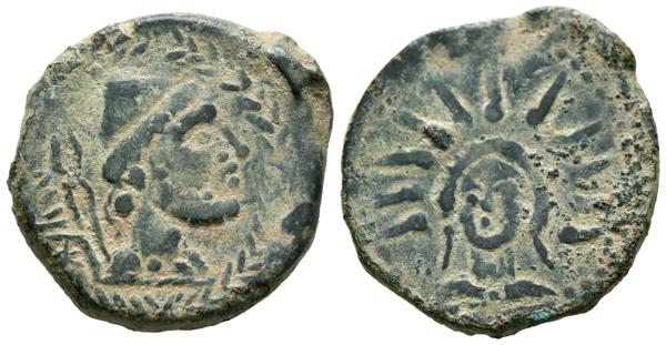 MALACA (Málaga). As. (Ae. 10,86g/26mm). 200-20 a.C. (FAB-1727). Anv: Cabeza de Vulcano a derecha, detrás tenazas y leyenda púnica tipo A. Rev: Cabeza de Helios de frente. MBC.