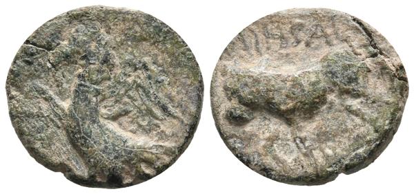 OBULCO (Porcuna, Jaén). Semis. (Ae. 3,92g/18mm). 220-20 a.C. (FAB-1844). Anv: Aguila a izquierda, debajo leyenda retrógada: OBVLCO. Rev: Toro a derecha, encima leyenda: MINSANI, debajo: SISIREN. MBC-.