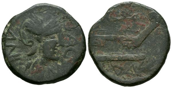 ARSE-SAGUNTO (Sagunto, Valencia). As. (Ae. 17,60g/30mm). 50-20 a.C. (FAB-2078). Anv: Cabeza galeada de Roma a derecha, alrededor leyenda: SAGVNTINV. Rev: Proa a derecha, encima Victoria, a la derecha caduceo, debajo leyenda ibérica: ARSE. MBC-.