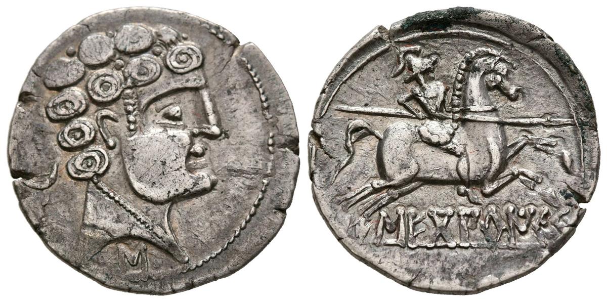 SECOBIRICES (Saelices, Cuenca). Denario. (Ar. 3,36g/19mm). 120-30 a.C. (FAB-2168). Anv: Cabeza masculina a derecha, detrás creciente, debajo letra ibérica: S. Rev: Jinete con lanza a derecha, asomando un pie. MBC+.