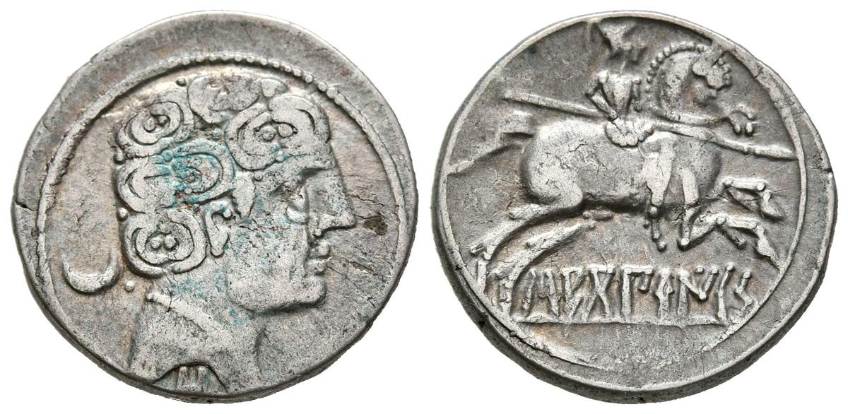 SECOBIRICES (Saelices, Cuenca). Denario. (Ar. 3,83g/19mm). 120-30 a.C. (FAB-2169). Anv: Cabeza masculina a derecha, detrás creciente y un punto, debajo letra ibérica: S. Rev: Jinete con lanza a derecha, asomando un pie. MBC.