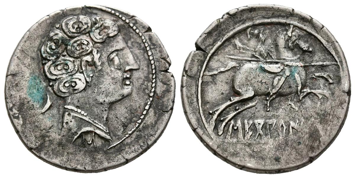SECOBIRICES (Saelices, Cuenca). Denario. (Ar. 4,15g/20mm). 120-30 a.C. (FAB-2174). Anv: Cabeza masculina a derecha, detrás creciente, debajo letra ibérica: S. Rev: Jinete con lanza y capa a derecha, asomando los dos pies. MBC-.