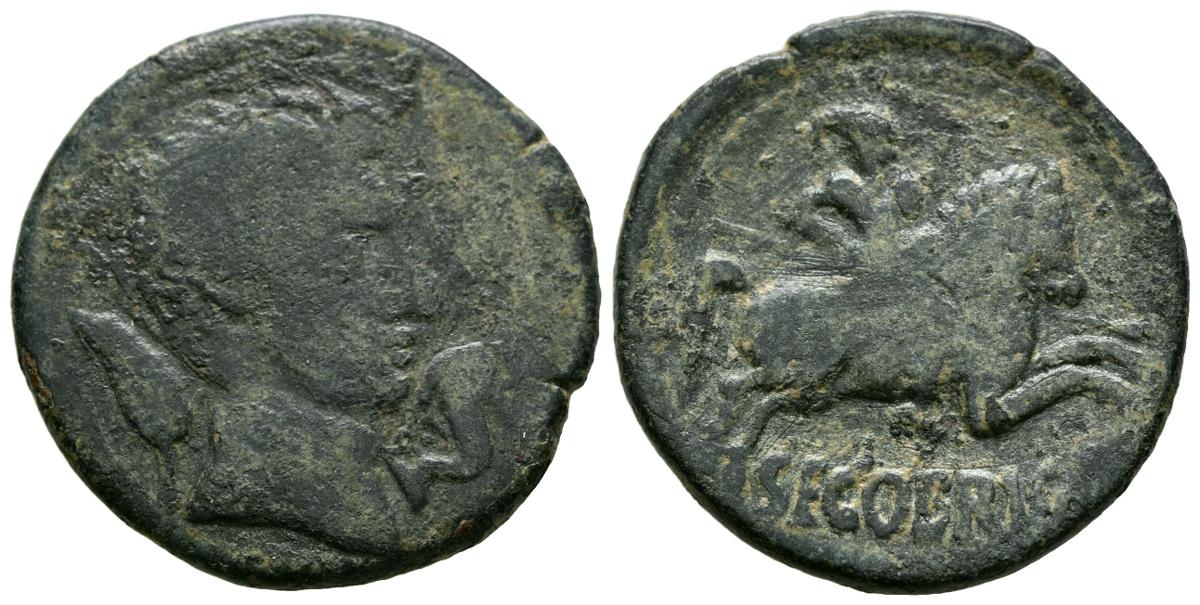 SEGOBRIGA (Saelices, Cuenca). As. (Ae. 9,26g/27mm). 30-20 a.C. (FAB-2182). Anv: Cabeza masculina a derecha, delante delfín, detrás palma. Rev: Jinete con lanza a derecha, debajo leyenda: SECOBRIGA. BC.