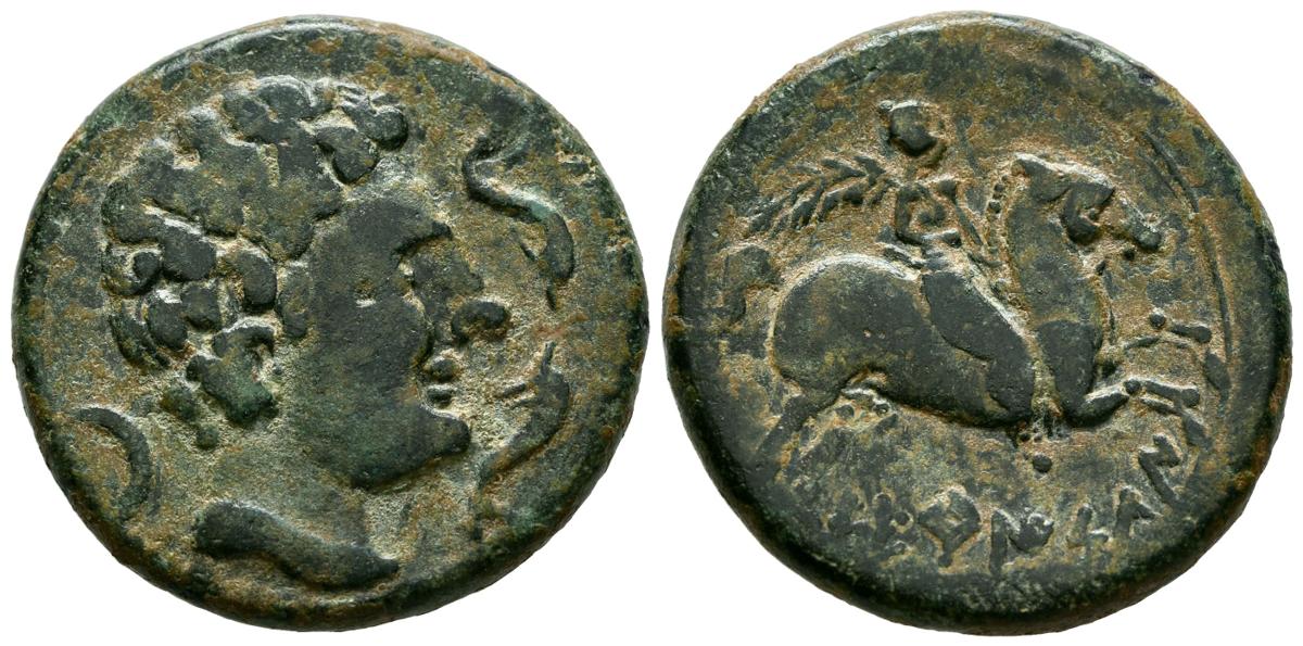 SETEISCEN (Sástago, Zaragoza). As. (Ae. 17,01g/29mm). 120-20 a.C. (FAB-2206). Anv: Cabeza masculina a derecha con adornos en el cuello, alrededor tres delfines. Rev: Jinete con palma a derecha, debajo leyenda ibérica: SETeISCeN. MBC. Raro ejemplar.