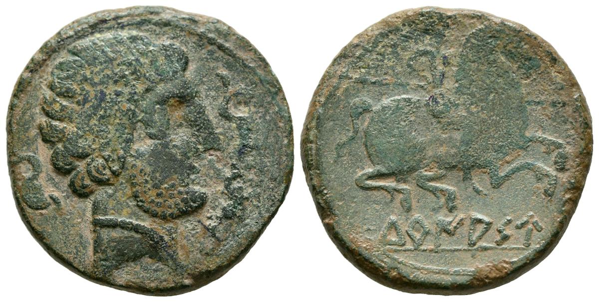 TURIASO (Tarazona, Zaragoza). As. (Ae. 10,25g/26mm). 120-20 a.C. (FAB-2428 var). Anv: Cabeza masculina barbada a derecha, alrededor tres delfines. Rev: Jinete con lanza a derecha, debajo leyenda ibérica: TuRIASU. MBC. Escaso ejemplar.