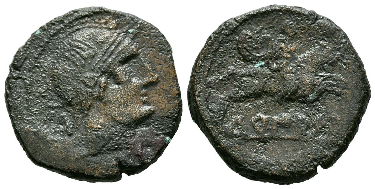TURIASO (Tarazona, Zaragoza). Semis. (Ae. 4,85g/20mm). 120-20 a.C. (FAB-2432). Anv: Cabeza galeada a derecha, detrás letra ibérica: Cu. Rev: Jinete a derecha, encima estrella y creciente, debajo leyenda ibérica: TuRIASU. BC+.