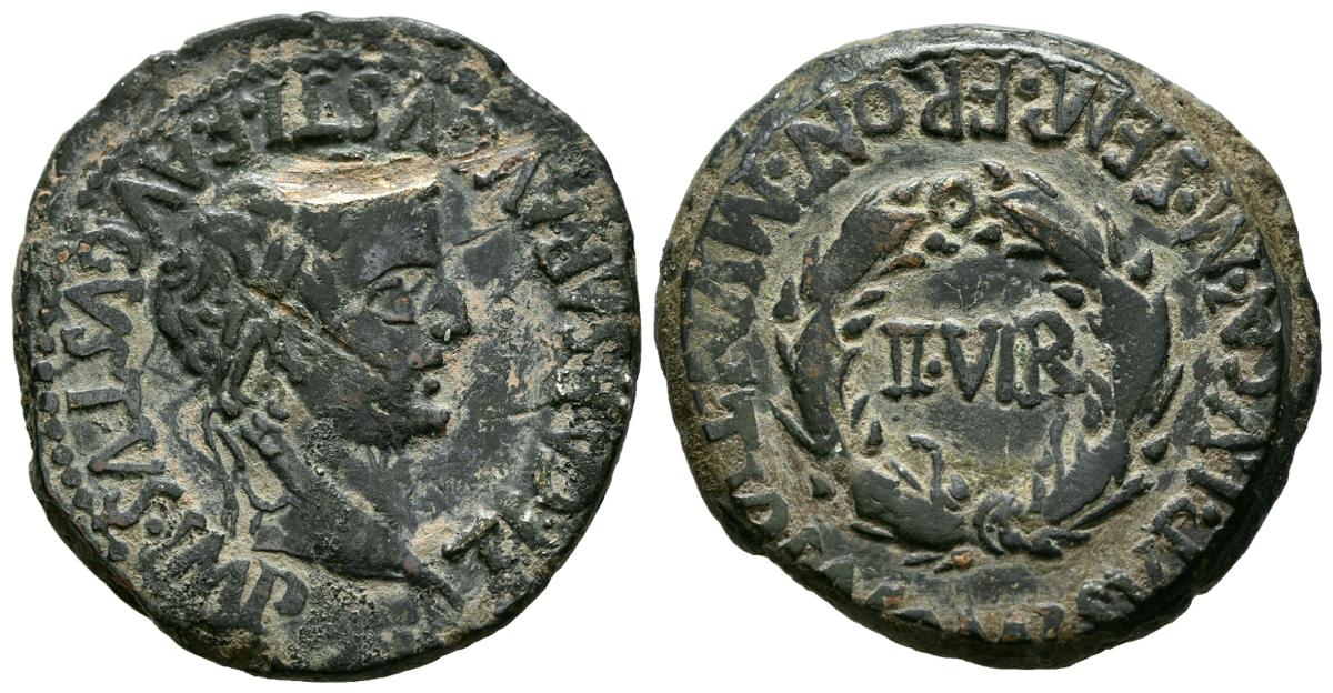 TURIASO (Tarazona, Zaragoza). As. (Ae. 12,35g/28mm). 14-36 d.C. (FAB-2455). Anv: Cabeza laureada de Tiberio a derecha, alrededor leyenda: TI CAESAR AVG F AVGVSTVS IMP P P. Rev: II VIR, dentro de corona de laurel, alrededor leyenda: MAN SVLP LVCAN M SEMP FRONT MVN TVRIASO. MBC+. Rozadura en anverso.