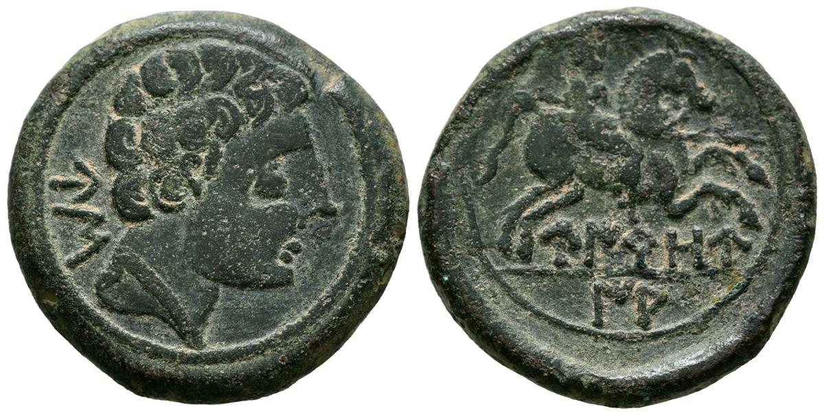 UIROUIAS (Borobia, Soria). As. (Ae. 14,58g/27mm). 120-20 a.C. (FAB-2481). Anv: Cabeza masculina a derecha, detrás letras ibéricas: US. Rev: Jinete con lanza a derecha, debajo leyenda ibérica en dos partes con línea entre ellas: UIROU/IA. MBC+. Bonito ejemplar, raro y más así.