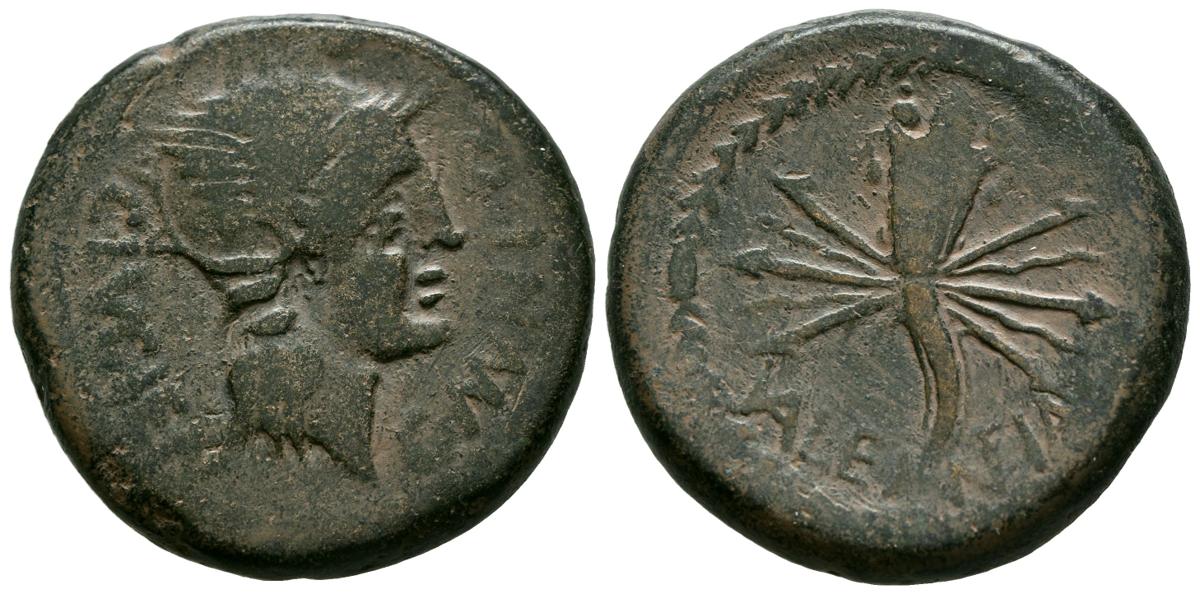 VALENTIA (Valencia). As. (Ae. 16,41g/28mm). 150-50 a.C. (FAB-2510). Anv: Cabeza galeada de Roma a derecha, alrededor leyenda: C MVNI Q C LVCIEN. Rev: Cornucopia sobre fúlmen, debajo leyenda: VALENTIA, dentro de corona de laurel. MBC. Escaso ejemplar.