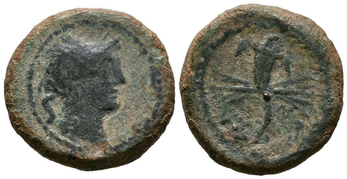 VALENTIA (Valencia). Semis. (Ae. 10,06g/23mm). 150-50 a.C. (FAB-2513). Anv: Cabeza galeada de Roma a derecha, detrás S. Rev: Cornucopia sobre fúlmen, en campo monograma: VAL, dentro de corona de laurel. MBC-.