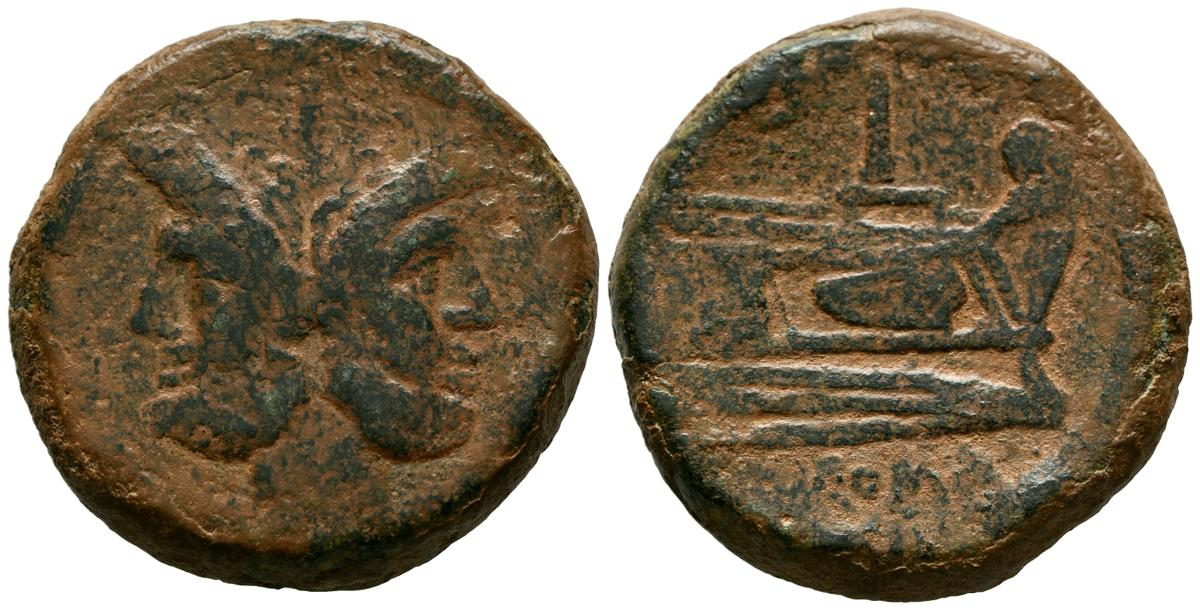 ACUÑACIONES ANONIMAS. As. (Ae. 42,88g/36mm). 211 a.C. Roma. (Crawford 56/2). Anv: Cabeza bifronte laureada de Jano, encima: I. Rev: Proa a derecha, encima: I, debajo leyenda: ROMA. MBC.