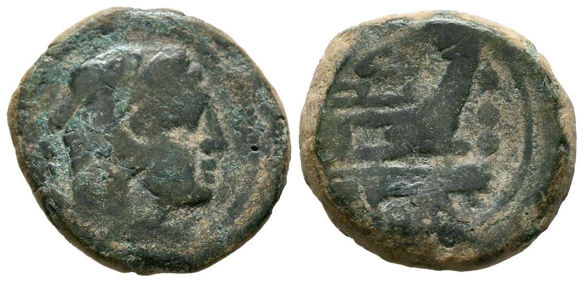 ACUÑACIONES ANONIMAS. Cuadrante. (Ae. 6,88g/20mm). 211 a.C. Roma. (Crawford 56/5). Anv: Cabeza de Hércules con piel de león, detrás tres puntos. Rev: Proa a derecha, delante tres puntos. MBC-.