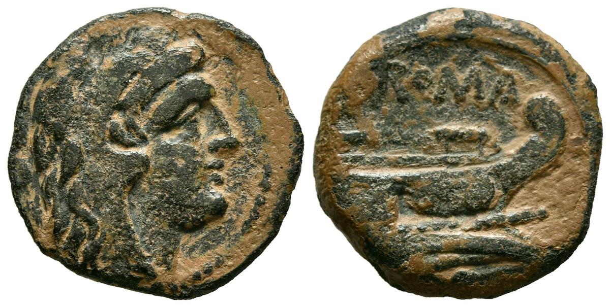 ACUÑACIONES ANONIMAS. Cuadrante. (Ae. 4,00g/18mm). 86 a.C. Roma. (Crawford 56/5). Anv: Cabeza de Hércules con piel de león, detrás tres puntos. Rev: Proa a derecha, encima: ROMA, detrás tres puntos. MBC.