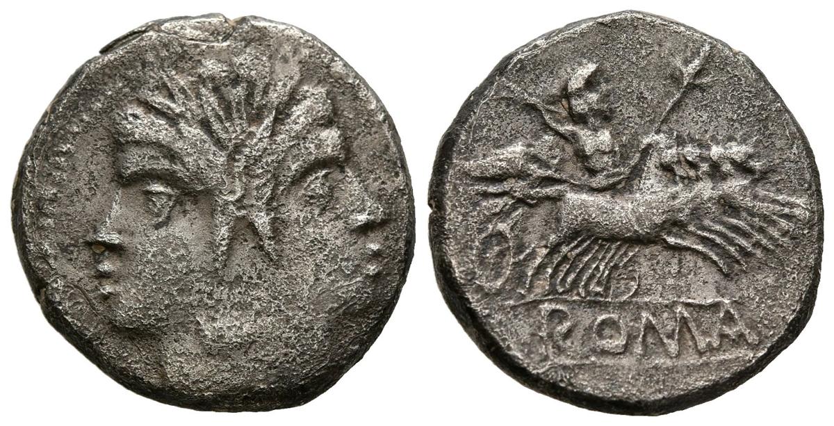 ACUÑACIONES ANONIMAS. Didracma. (Ar. 6,20g/19mm). 220-205 a.C. Roma. (Crawford 29/3). Anv: Cabeza de Jano bifronte laureada. Rev: Júpiter conduciendo cuádriga con cetro y rayo a derecha, debajo leyenda entre dos líneas: ROMA. MBC-.