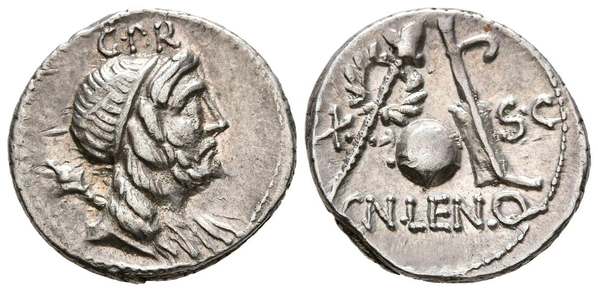 GENS CORNELIA. Denario. (Ar. 3,82g/19mm). 76-75 a.C. Hispania. (Crawford 393/1; FFC 627). Anv: Busto diademado del Genio del pueblo romano a derecha, a su espalda cetro, encima: GPR. Rev: Globo terrestre entre cetro con corona de laurel y Timón, en campo: EX-SC, debajo: CN LEN Q. EBC. Restos de brillo original. Bonito ejemplar, escaso así.