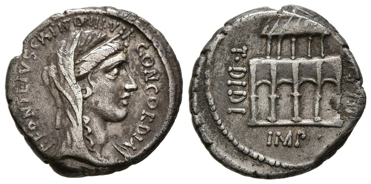 GENS DIDIA. Denario. (Ar. 3,86g/18mm). 55 a.C. Roma. (Crawford 429/2a; FFC 677). Anv: Cabeza diademada y velada de Concordia a derecha, alrededor leyenda: P FONTEIVS CAPITO III VIR CONCORDIA. Rev: Fachada de la Villa Pública con dos pisos de columnas y arcos, alrededor leyenda: T DIDI IMP VIL PVB. MBC+. Escaso ejemplar.