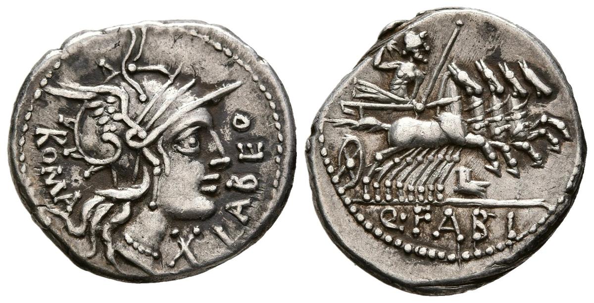 GENS FABIA. Denario. (Ar. 3,85g/20mm). 124 a.C. Norte de Italia. (FFC 697; Crawford 273/1). Anv: Cabeza de Roma a derecha, debajo X, delante leyenda: LABEO, detrás leyenda: ROMA. Rev: Júpiter en cuádriga a derecha con cetro y haz de rayos, debajo proa de nave, en exergo: Q FABI. MBC.