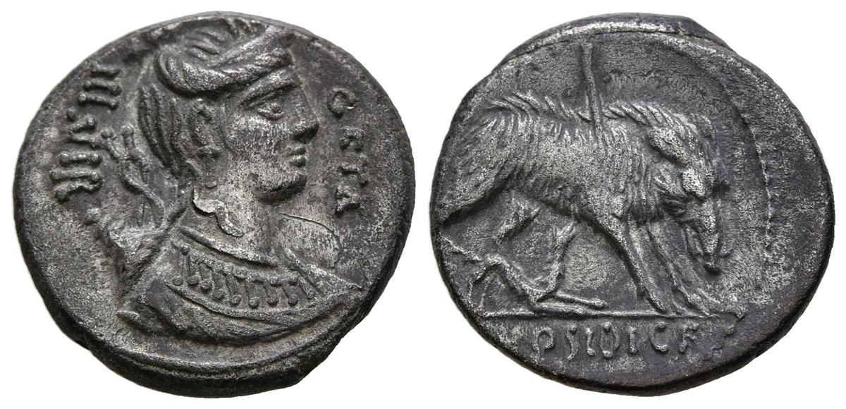 GENS HOSIDIA. Denario. (Ar. 3,64g/17mm). 68 a.C. Ceca incierta italiana. (Crawford 407/2; FFC 748). Anv: Busto diademado de Diana a derecha con arco y carcaj en la espalda, alrededor leyenda: GETA III VIR. Rev: Jabalí a derecha atravesado por una flecha y siendo atacado por un perro, en exergo: C HOSIDI CF. MBC+.