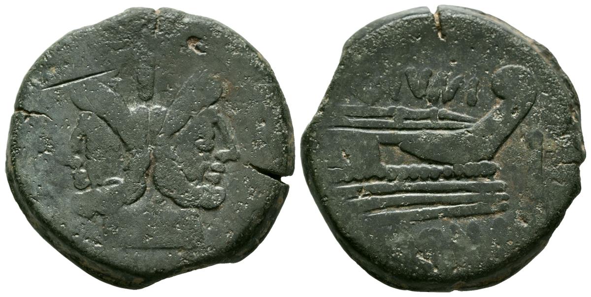 GENS JUNIA. As. (Ae. 21,72g/30mm). 149 a.C. Roma. (Crawford 210/2). Anv: Cabeza de Jano bifronte, encima I. Rev: Proa a derecha, encima leyenda: C IVNI, debajo: ROMA, delante I. MBC-.