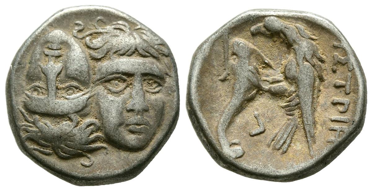MOESIA, Istros. Dracma. (Ar. 5,44g/17mm). 280-256 a.C. (HGC 3, 1803). Anv: Cabezas laureadas invertidas enfrentadas. Rev: Aguila con delfín a izquierda, encima leyenda griega, debajo monograma griego. MBC-.En aras de nuestra habitual transparencia y para protección de nuestros clientes, nos vemos obligados a retirar este lote de nuestra subasta ante las dudas surgidas acerca de su originalidad. Disculpen las molestias.